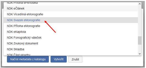 Zobrazí se dialogové okno, ve kterém z rozbalovací nabídky vyberte model NDK Svazek eMonografie.