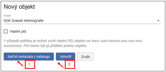 2. Založením prázdného objektu pomocí tlačítka Vytvořit. V tomto případě je potřeba metadata vyplnit ručně.