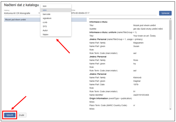 Po výběru správného záznamu klikněte na Vytvořit. Otevře se nové okno s formulářem, do kterého se automaticky zkopírují metadata z katalogu: