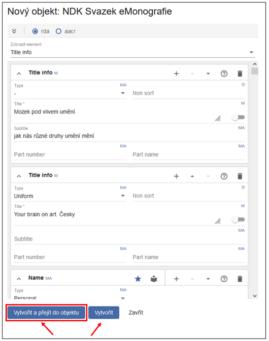 Doporučujeme zvolit Vytvořit a přejít do objektu, abyste mohli metadata ihned zkontrolovat.