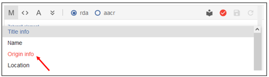 Pokud je tato ikona červená, formulář obsahuje chybu. Pro snadné nalezení problematického elementu je možné si rozkliknout rolovací nabídku s elementy, zde bude nevalidní element označen červeně, např. zde je chybně Origin info: