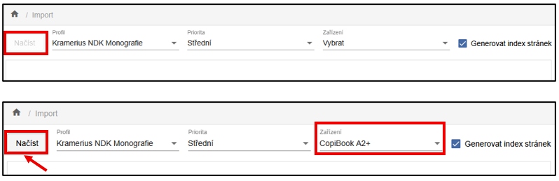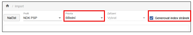 Import FOXML na rozdíl od ostatních typů importu vyžaduje zadání digitalizačního zařízení. Při výběru importního profilu je nutné zvolit Zařízení z příslušné roletky, jinak nelze import spustit.