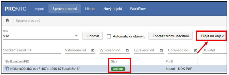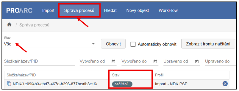 Ve Správě procesů je filtr pole Stav přednastaven na hodnotu Načteno. Pro sledování celého průběhu importu je vhodné změnit tuto hodnotu na Vše, aby bylo možné sledovat jednotlivé fáze procesu od Načítání přes Ukládání až po stav Uloženo.