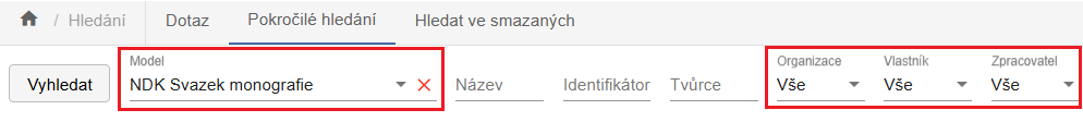 Vyhledávání podle polí s hodnotami z roletky (červeně označená pole) spusťte pomocí tlačítka Vyhledat.