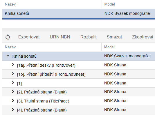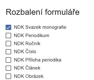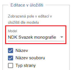 V nastavení označíme, že chceme formulář při založení objektu NDK svazek monografie plně rozbalený. Po uložení se tento model přesune na začátek seznamu dostupných modelů: