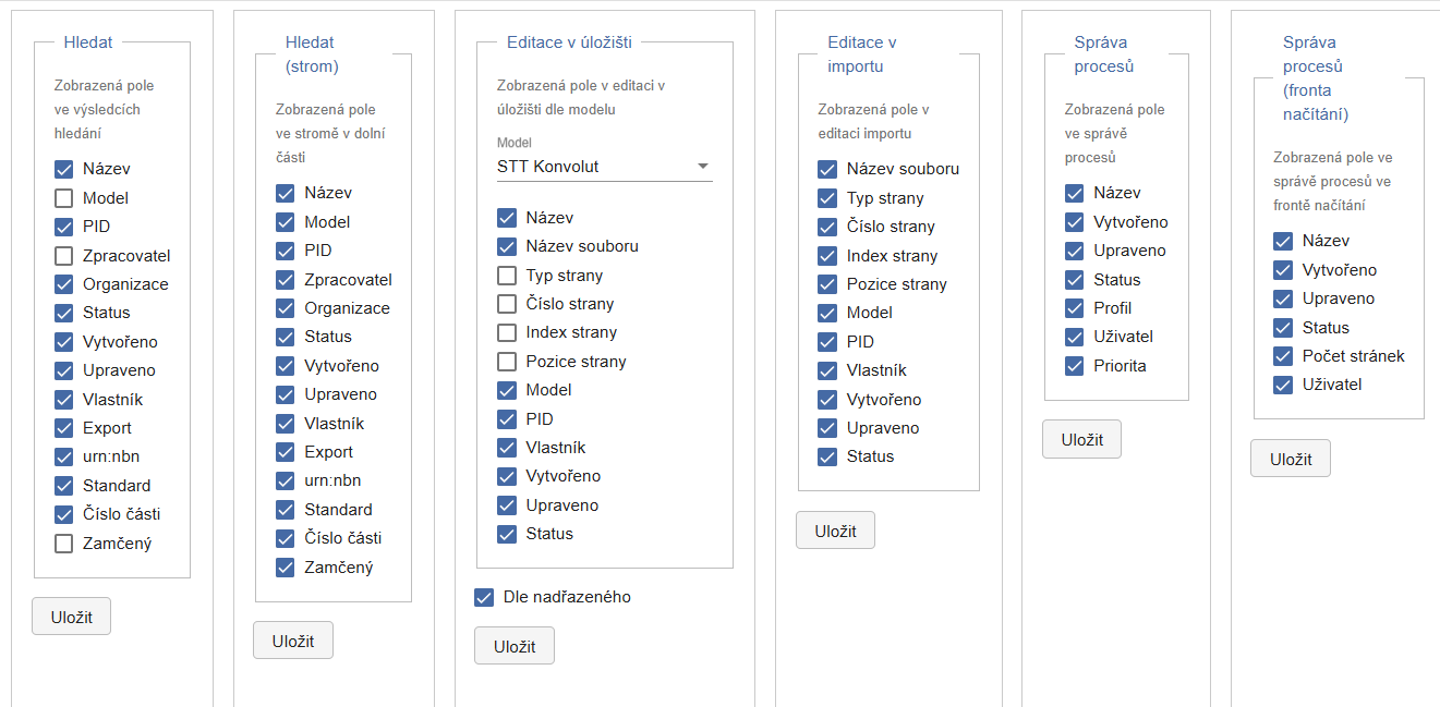 Pro změnu nastavení konkrétní obrazovky označte jen ta pole, která chcete zobrazovat a uložte. Pokud chcete upravit i pořadí sloupců, klikněte na vybrané pole levým tlačítkem myši, přetáhněte je na požadovanou pozici a opět uložte.