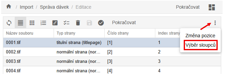 Ve všech přehledových obrazovkách (např. úložiště, import, správa procesů) můžete upravit zobrazení sloupců a jejich pořadí.