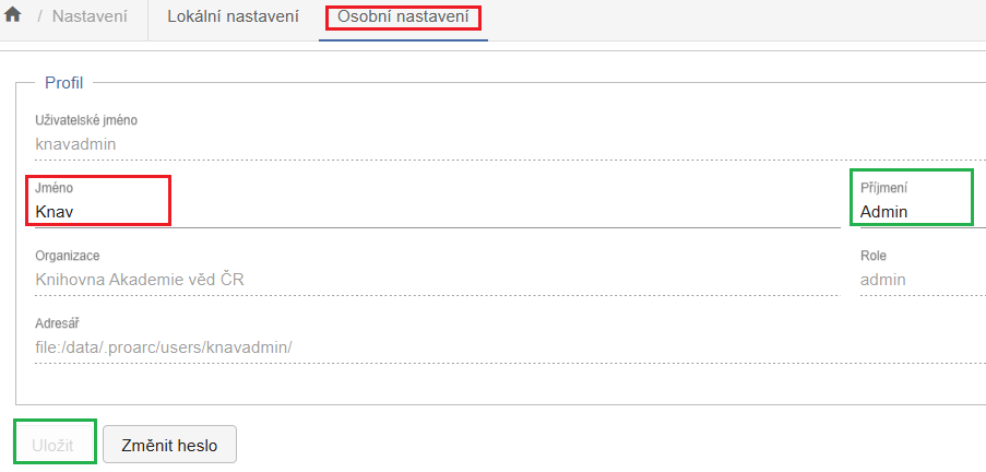 V sekci Osobní nastavení můžete upravit pouze ty hodnoty, které jsou v polích otevřených pro editaci, jsou to jméno, příjmení a heslo.