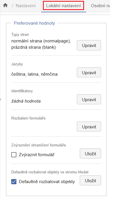 V lokálním nastavení můžete nastavit preferované typy stran, jazyk a identifikátory, které se poté zobrazují na začátku výběrových seznamů ve formulářích.